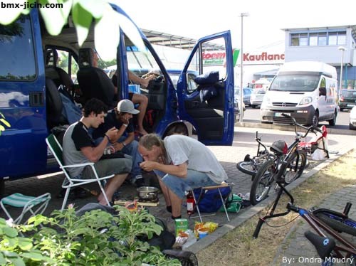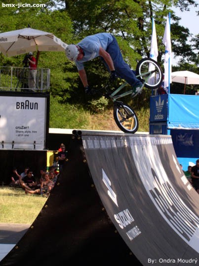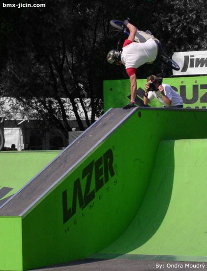BMX Masters 2005 - Cologne Text: Hout Fotos: Ondra Moudrý 23.-26.6. 2005, se konal v německým Kolíně nad Rýnem contest s názvem Suzuki Bmxmasters 2005. Do Kolína vyrazila z Čech poměrně velmi nepočetná partička a to David Pánka, Tomáš Vondráček, Dan Miler, „Kikán“ Žlůva, Ondra Moudrý a Hout. Do Kolína jsme ve středu přijeli pozdě večer. Očekával nás zde už Hasák společně s Honzou Jílkem a mladým olomouckým flatařem Robertem. Postavili jsme stany, narazili pivka a diskutovali, co na nás po loňským vydařeným mistrovství světa Kolín tento rok přichystá. V dalším textu se zaměřím přímo na jednotlivé disciplíny, který jsem sledoval. STREET Na street byl připravenej v Kolíně již tradičně velmi kvalitní park, který byl z každé strany uzavřen velkými wallridy a uprostřed byl nepříliš velký funbox, jakoby spina se subboxem a klasická spina. Funbox měl nepříliš prudkej oboustrannej radius a ze strany bang. Kategorii expertů, která se jela hned ve čtvrtek dopoledne přeskočím, jelo ji velice málo lidí (z Čechů nikdo) a rozhodně nebylo o co stát, takže jsem jel radši obdivovat s Ondřejem Moudrým krásy města. Mimochodem Kolín je fakt parádní město. Další kategorií byli mástři, do který nastoupila z naší bandičky hned trojice jezdců a to Tomáš Vondráčků, Dan Miler a Kikán. Nejlíp zajel určitě Dan, kterej vytočil slušnou 360 jak přes funbox tak i přes spinu, přidal k tomu ještě svůj oblíbenej handplant a další věci a bylo z toho nakonec 14. místo, těsně za branami finále. Vondras zajel svou klasiku, takže 360ky, nějaký walltapy a spadly mu nohy při tailwhipu. Ale na to, že se Tomáš v parku projel tak 10 minut před závodem, tak slušná práce. Vůbec to nesedlo Kikánovi, kterýmu se hned na začátku nevyved turndown přes funbox a od toho se už odvíjela celá jeho jízda. Mástry stejně jako v Praze zabil svým stylem a parádníma trikama anglickej Mike Miller, jeho 360 lookback, 360 tabletop či tailwhipy si ze Štvanice jistě každý pamatuje. Nejostřeji sledovanou kategorií byly samozřejmě Pros, kterých se tu nakonec sešla taky početná parta. Největšími hvězdami byli bezpochyby Ryan Nyquist, Allan Cooke, Corey Martinez, Bruce Crisman, Dave Osato, Hannu Cools a další. Kvalifikace se jela za úmornýho vedra a nikdo to nijak zvlášť nehrotil. Vyhrál ji Corey Martinez se svýma oboustrannýma 360kama přes spinu, tailwhipama a kde čím. Ve finále se to vyhrotilo o poznání víc. Velmi překvapil Ben Wallace z Anglie, kterej dával tailwhipy na všem, ze všeho a do všeho, odjel čistě doubletailwhip na funboxu i doubletailwhip 180 radius to bang, velkej a nečekanej náser od Bena Wallace. Nakonec z toho bylo dokonce 2. místo. Dave Osato, kterýho jsem si za těch pár dnů na Štvanici a tady v Kolíně docela oblíbil, si opět tak flegmaticky pojížděl po parku a tuhle vytočil 720 na spině, tamhle dal beko a tady 360 tailwhip, na závěr svý jízdy si napodruhý dal přes spinu něco, co bych nazval asi jako tailwhip to 360 tailtap!!! Nehorázná věc. Bruce Crisman si jel svou klasiku, takže parádní vysoký 360 na spině, nějakej ten suicide, wallride to barspin a halfcab přes spinu. Corey Martinez ve finálku nezajel tak čistě jako v tréninku, avšak sázel o to vostřeji. Téměř se mu podařilo odjet barspin to icepick to barspin out na určitě aspoň 1,5 metru vysokým subboxu, dal si wallride to doublepegger to barspin out na největším wallridu a spoustu dalších vychytávek. Zkrátka Corey Martinez se ukázal v plný parádě, radost koukat. Allan Cooke taky hrotil slušně. Zavdal backflip barspin transfer, barspin to walltap, tailwhipy, truckdrivera a další věci. Na pochybách v parku rozhodně nikoho nenechal Ryan Nyquist. Jeho obrovský flairy, stoprocentně jistá 720 přes funbox i přes spinu, doubletruckdriver, 540 barspin či 360 přes skoro metr a půl vysokej subbox, cokoliv dodávat netřeba. Ryan to tam prostě má. Zmínit ještě musím Kanaďana Dustina Guenthera, kterej ve finále spadnul hned v úvodu svý jízdy při transferu fastplant tailwhipem a dál už nepokračoval, ale kvalifikaci zabil ve velkým štýlu, když odjel nosepick nahoru na wallride a celkově zle nakládal. Street tedy určitě nátěr jak svině. Jak to nakonec vše dopadlo se dočtete někde dole. MINIRAMPA Minirampa měla v Kolíně vynikající úroveň a to hlavně díky Ryanu Nyquistovi, ale nepředbíhejme. Kvalda profíků byla naplánována na čtvrtek, avšak z trochu záhadných důvodů se nejela. Spekulovali jsme, že tady je tak málo pro riderů (ve čtvrtek to tak skutečně vypadalo), že se pojede rovnou finále místo kvaldy a to až někdy v sobotu nebo neděli. Jako první proběhnul tedy paradoxně besttrick, kterej jsem neviděl, protože ve stejnou dobu se poprvý otevřel dirt, což mě nenechalo chladným a šel jsem si zalítat. Každopádně byly v mini údajně k vidění zvěrstva hrozný, například téměř odjetej doubletailwhip to tailtap od Dave Osata či Clint Millar a jeho čistej downsidetailwhip to nosepick. Tímhle kouskem snad i besttrick contest Millar vyhrál. Kvalifikace minipro nakonec proběhla a to tuším v pátek. Největší nátěr ale přišel v sobotu, kdy se jelo finále. Absolutně nejvíc vše zabil Ryan Nyquist. Teď je mi už naprosto jasný, proč komentátoři občas Ryana označujou jako „the machine“. Ryan sázel opravdu jak nějaká mašina, neskutečně vysoký polety plný nejvíc hustejch triků, sérky typu 2 metry vysoká 360 onehanded tabletop, polet, doubletruckdriver, polet, 360 onehanded x-up, obrovskej flair, nosepick to doublebarspin, manual nahoru, backflip suicide, polet, 720, downsidetailwhip, ... Takhle a podobně vypadaly Nyquistovy jízdy, všechno čistě, všechno s přehledem. Jednoduše neuvěřitelný. Kromě tohohl