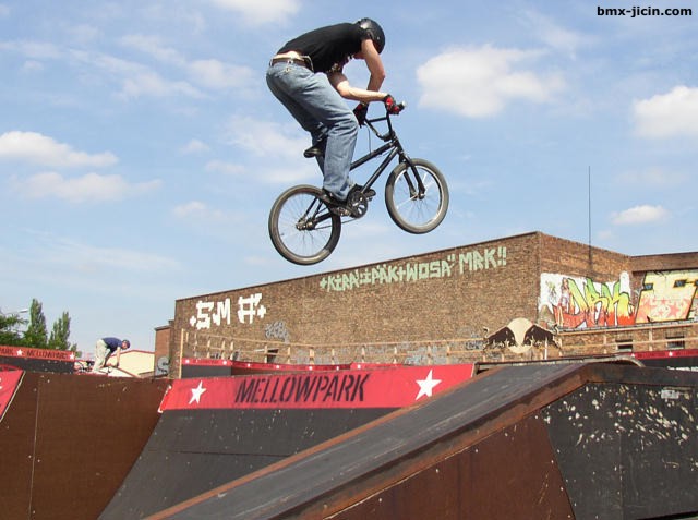 A ještě pár slov k Mellowparku. Tak ten se nachází ve východním Berlíně ve čtvrti Köpenick, vlakem tak půl hodiny od centra. Na začátku 90. let se zde soustřeďovala alternativní kultura východního Berlína a různý postavičky této scény okupovaly místní squat. Postupem času vykrystalizoval nápad udělat tady víceúčelový centrum pro alternativní sporty (bmx, skateboarding) a spojit to s dalšími oblíbenými sporty jako je beach volejbal nebo basketbal. Tak vzniknul přes mnoho a mnoho problémů tuším někdy koncem 90. let Mellowpark V současný době se v něm nachází menší hřiště na basket, minimini rampa pro sk8, minirampa se spinou pro bmx, luxusní park na kola i na sk8 (zhruba 70% na kola, zbytek pro sk8), trailsy, 2 kurty na plážovej volejbal a hřišťátko na fotbálek. K tomu nepříliš čistá řeka Spree, ale koupat se v ní dá. Vstup jsou 2 Eura, pokud tedy jdete jezdit, jinak free. V parku je správce Max, potom jsou zde zaměstnaný ještě stavitelé skoku Hans (mimochodem šéfredaktor německýho magazínu Zwanzig) s Medvědem a ještě spousta dalších lidí, kteří vyrábějí překážky, starají se o administrativu a promotion, zkrátka všechno, co je potřeba k chodu takovýho centra. Vše je z velký části dotováno městem.