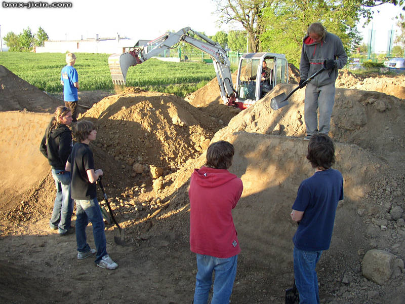 První zastávka Red Bull Backyard Diggeru, naprosto unikátní akce na podporu dirtu u nás, proběhla ve Dvoře Králové o minulém víkendu tedy 27.-29.4. 2007. Celý Red Bull tým včetně jičínské trails crew se sešel už ve čtvrtek 26.4. Místní lokálové nás vřele uvítali, pak jim trošičku zamrzl úsměv, když jsem jim předhodil zbourání celého jejich dosavadního díla, tedy tří lajn spíše dirtových skoků, který musely stát nemálo práce a potu. Nakonec jsme se dohodli a už ve čtvrtek večer se započalo s pracema. Původní vize představovala čtyři lajny. Jednu malou a jednu velkou čistě dirtovou a potom dvě lajny technický trailsový se zatáčkama, transferama apod. Následující tři dny dřel celý tým čítající něco okolo 12ti lidí takřka bez přestávky na 120 %, aby bylo vše na neděli připraveno. To se nakonec podařilo a v neděli odpoledne čekalo na poměrně početnou skupinku jezdců celkem 17 skoků, který se daly, jak se nakonec ukázalo, všechny nalítat. Osobně toto považuji za malý zázrak, postavit za 3 dny z ničeho 17 skoků všech tvarů a velikostí, který se dají skočit, to je velkej nátěr. Dobře Red Bull crew.