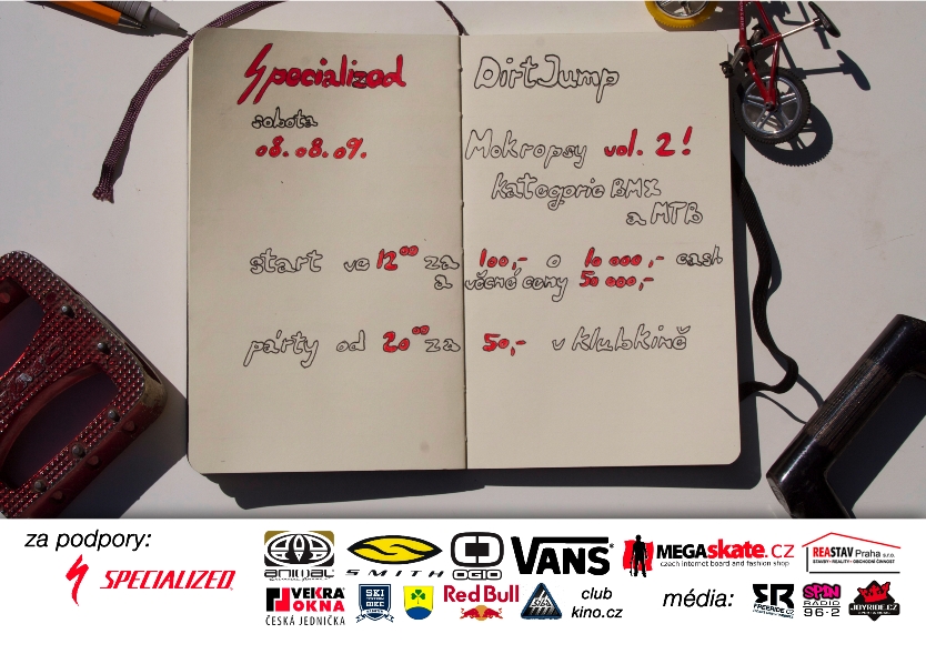 Propozice - Specialized Dirt Jump Mokropsy Vol. 2 By: On Fotky: © Kuba Frey Rok se s rokem sešel a my máme tu čest Vás opět pozvat na již druhý ročník závodu Specialized Dirt Jump, který se uskuteční 8. srpna 2009 kde jinde než v dirt parku v Černošicích – Mokropsech. Za podpory: Specialized, Animal, Smith, Ogio, Vans, Megaskate.cz, Reastav Praha, Vekra okna, Ski a Bike Centrum Radotín, Město Černošice, Red Bull, Clubkino, Šiba Mediální sponzoři: Freeride.cz, Radio Spin, Joyride Stejně jako minulý rok jsou pro Vás připraveny dvě kategorie BMX a MTB , kde se můžete utkat o celkové prize money 10 000 Kč a věcné ceny dokonce v hodnotě 50 000 Kč. To vše po zaplacení startovného 100 Kč , ke kterému dostanete, jak je ostatně již zvykem, plechovku Red Bullu + vstup na afterparty. Co se oproti minulému roku změnilo zásadně, je vlastní dirtoviště. Standardní hlavní část z minula (i.e. drop, tři středně velké dvojáky a step-up) je doplněna klopenkou, která Vás zrychlovákem dostane do protisměrné lajny, která čítá dvojáky čtyři. Ta je ukončena opět step-upem a zase klopenkou, takže se úplně nabízí možnost jezdit bez zastavení či šlápnutí pedalů kolem dokola... Samozřejmostí je spousta dalších menších skoků na rozeskákání, hliněná spina apod. Další změnou, tentokráte bohužel nepříjemnou, ba přímo tragickou, je zánik Rip Curl Pláže Mokropsy. Jak se k Vám možná již doneslo, pro tuto sezónu se ji Vašku Davidovi kvůli nepřízni úřadů nepovedlo zprovoznit. Což ovšem neznamená, že bychom byli celé závody bez občerstvení! Na place budou samozřejmě stánky se stejky, klobásami, pivem a plažový bar, který budiž vzpomínkou na ten z minulého roku s míchanými nápoji... Celou akcí nás bude provázet speaker On a Dj Kulich z 69 , oba nám již dobře známí z předchozího ročníku. Dj Kulich a jeho gramce nás ostatně budou provázet taktéž na večerní afterparty, která se uskuteční od osmé hodiny večerní v místním vyhlášeném Clubkině. Vstupné bude činit 50 Kč , pro jezdce samozřejmě zdarma, bujaré oslavy budou pokračovat do ranních hodin. Pokud toho bude na Vás již příliš, nabízí se možnost odjet jedním z nočních vlaků směr Praha (poslední odjíždí před dvanáctou hodinou) či přespat ve stanovém městečku pro tyto účely zřízeném vedle dirtoviště. Další možností jsou místní penziony s rozdílnými cenami i kvalitou: