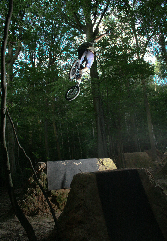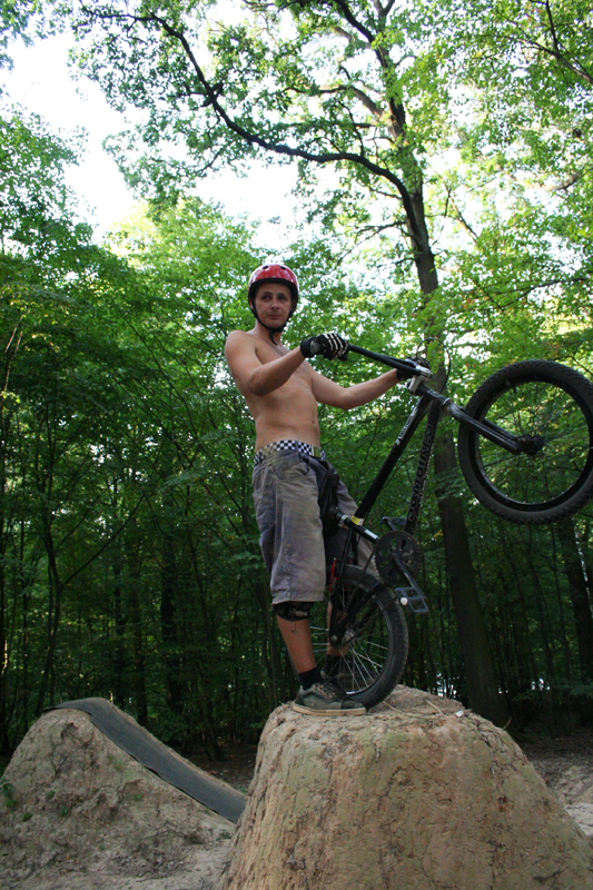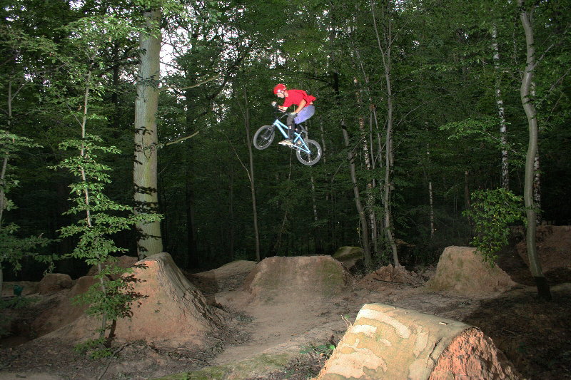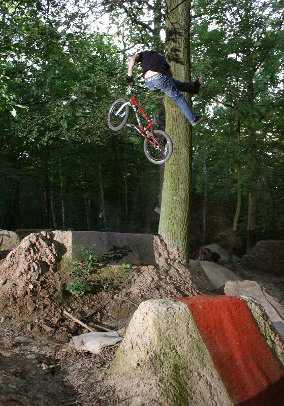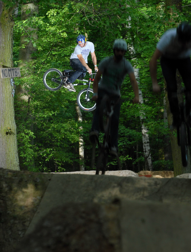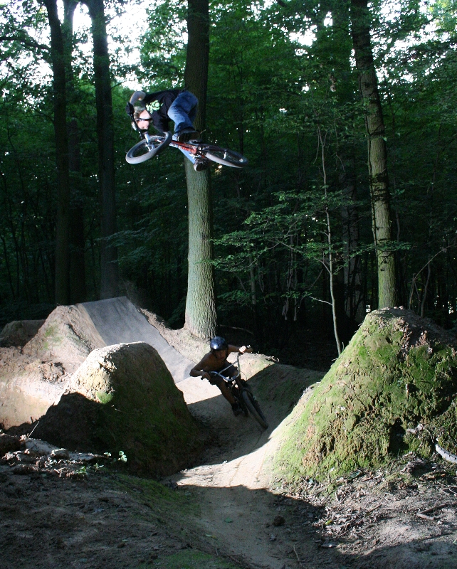 Potom se Hout s Kudrem pouští do stavby hlíny na Bikehall, trávíme na tom skoro měsíc a na les není čas. Hout si ještě stihne v Trutnově vysrat koleno, heh. A pak přišel Bikehall a s Bikehallem asi nejlepší session, jaká kdy v lese byla. Samozřejmě je řeč o návštěvě anglický DC party v lese. Ať to jsou šampóni jaký chtěj, na kole tyhle kluci jezdit opravdu uměj. A v lese to taky ukázali. Luxus šály, největší jistota, stylový triky, obrovský vejšky. K nim se přidal ještě Kudr, Dudo a další a to byla paráda. Velký zážitek a poučení, že se pořád ještě máme hodně co učit a že to jde sakra líp, než si myslíme. Škoda jen, že v té době ještě nebyla ready BIG DIG lajna, to bych chtěl vidět.